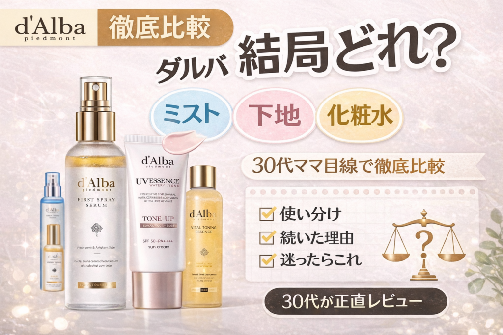 【本音比較】ダルバ3商品どれが正解?ミスト・下地・化粧水を30代ママ目線で使い分け
