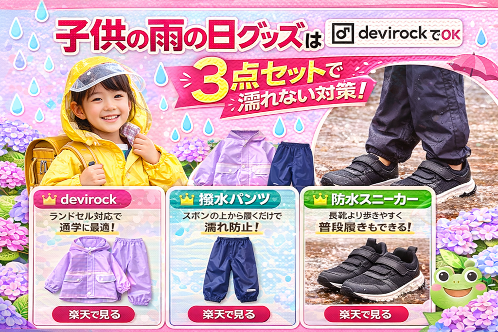 子供の雨の日グッズおすすめ|カッパ・撥水パンツ・防水スニーカーで濡れない対策