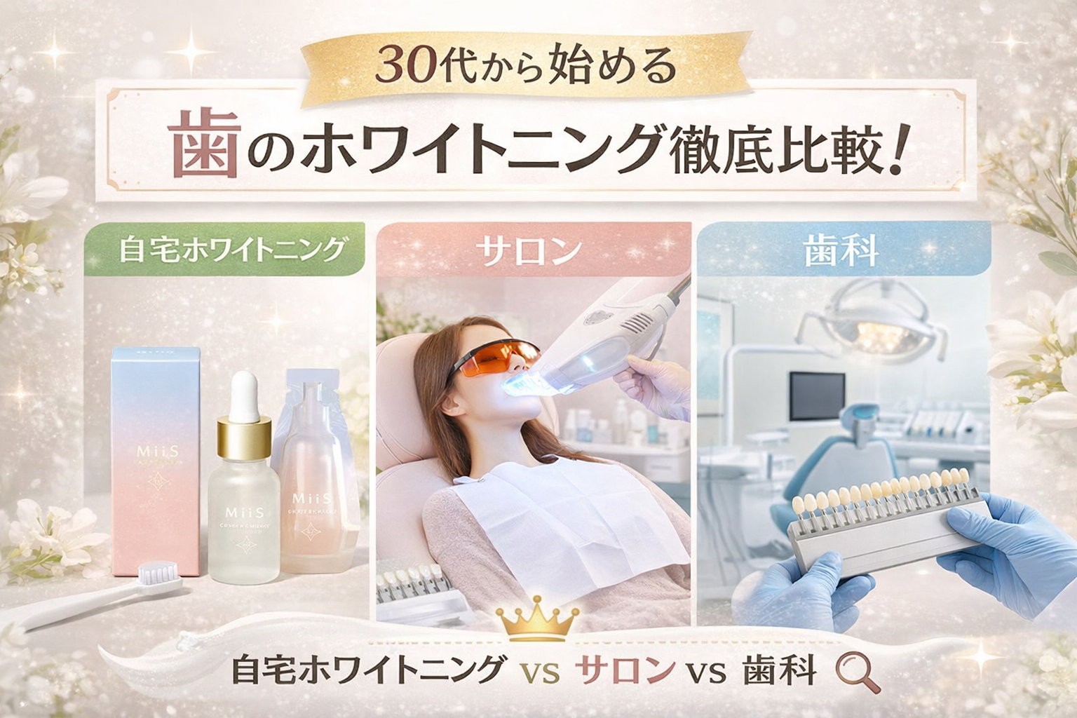 この記事では、自宅ホワイトニング・サロン・歯科の違いをわかりやすく比較し、 30代が選ぶべきホワイトニング方法を徹底解説します。