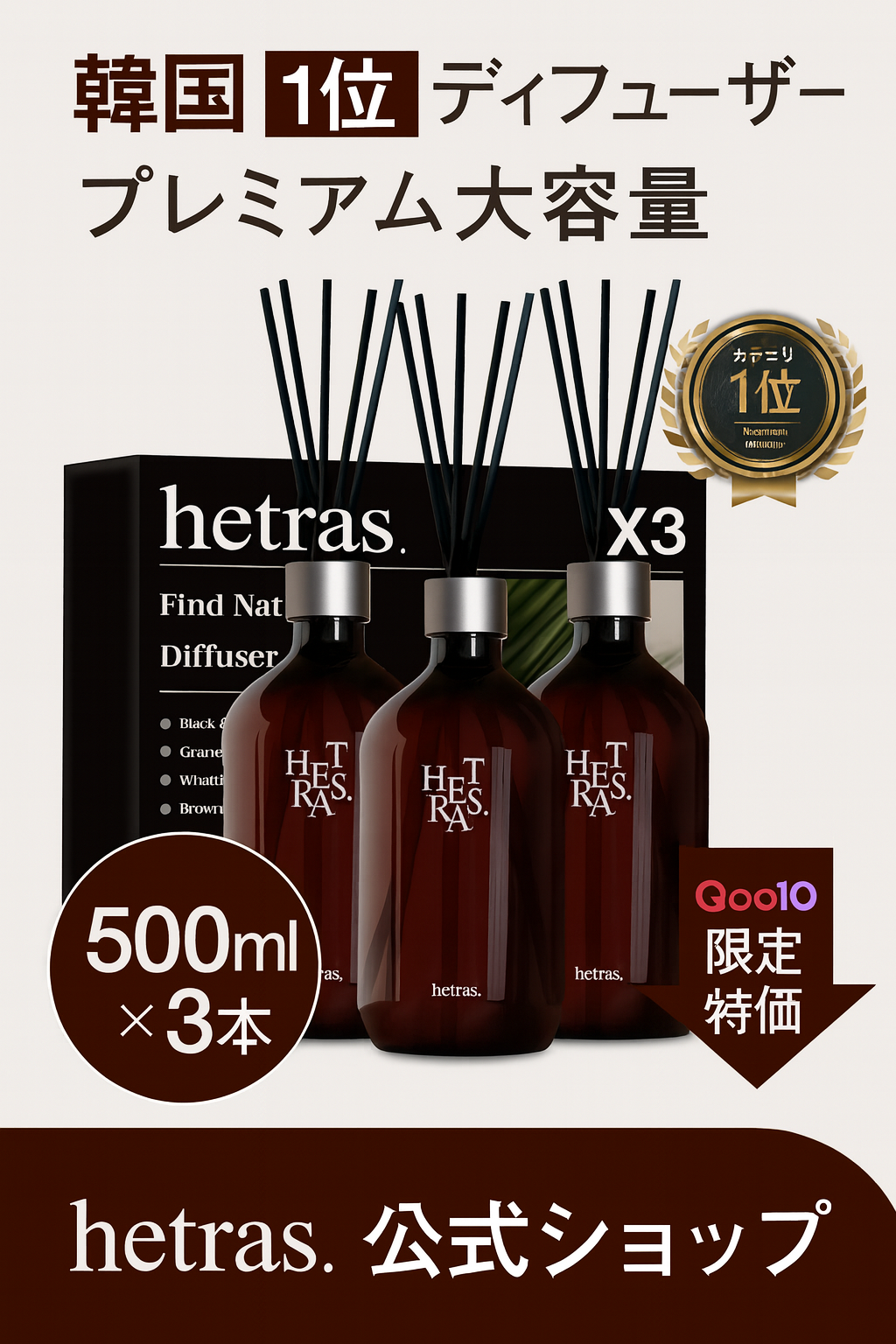 hetras(ヘトラス)は、韓国で大人気のルームフレグランスブランド。上品でクセが少なく、どんな部屋にも似合う香りが特徴です。高級ホテルのような洗練された香りが楽しめるとSNSでも注目されています。