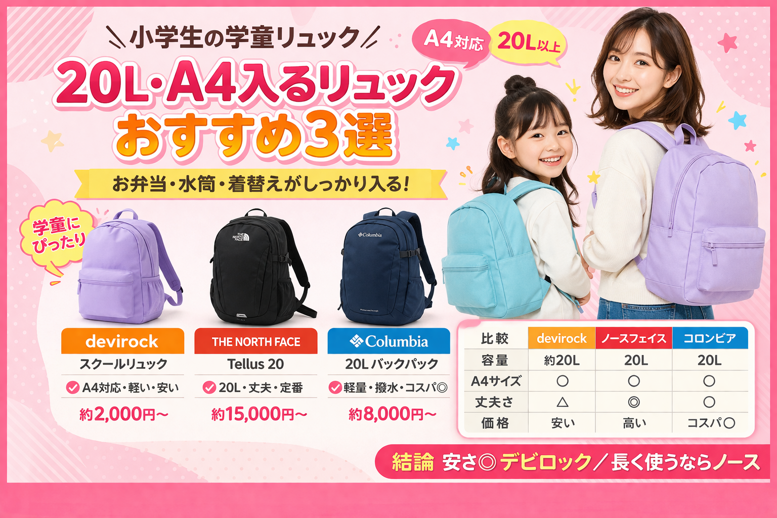 学童は荷物が多いので、A4サイズが入る・20L以上のリュックが使いやすいサイズです。